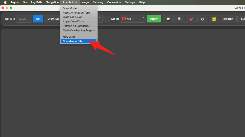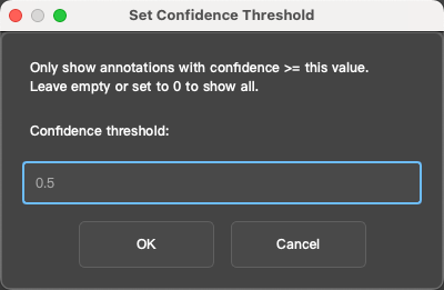 When the labels are points or bounding boxes in YOLO format, you can use the Confidence Filter feature to display only the objects on the current page whose confidence is greater than or equal to the threshold.